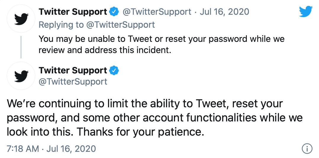 事件不断被放大,越来越多美国政界、娱乐界和科技界人士的Twitter账号被攻陷。Twitter官方在数次大规模删除推文无效后,不得已切断了所有认证用户的发帖及修改密码等功能,表示将在最短时间内控制诈骗信息的传播。