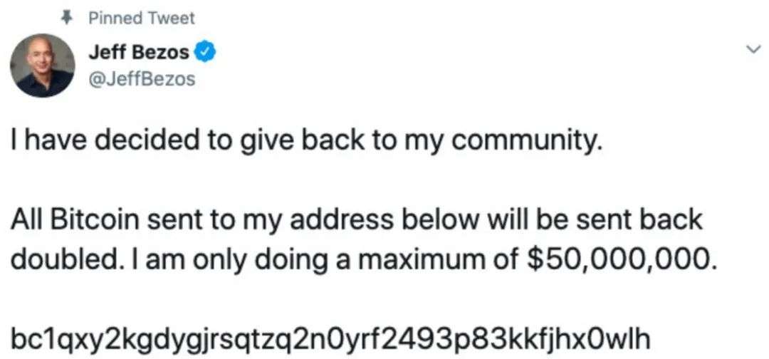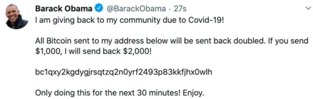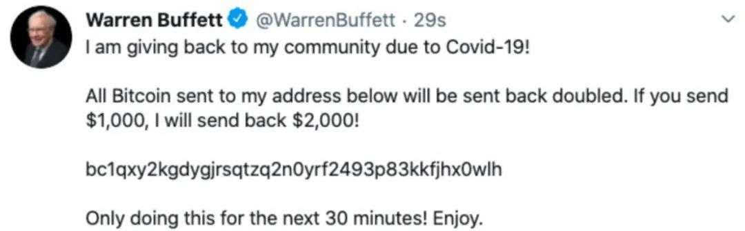 一则内容、话术、语气,甚至标点符号都相同的推文,被美国各界名流在同一时间发布在自己的Twitter账号上。推文大意为:因为新冠疫情肆虐,我要回馈社会!所有向以下地址发送比特币的人,都将获取双倍的回报。你发送1000美元,我就返给你2000美元!