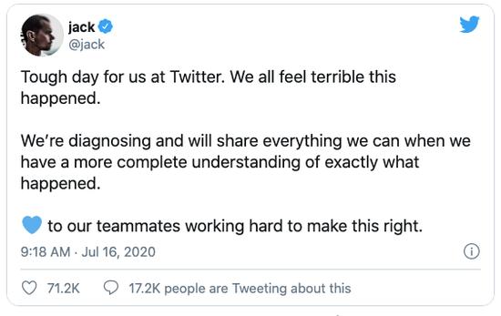 “今天对所有Twitter用户来说都是难熬的一天,所有人对发生的一切感到同样糟糕。我们正在全力修补系统问题,所有消息都将与大家同步,也会对此次网络安全事件进行全面复盘。” Twitter创始人Jack Dorsy在平台上公开表达歉意。