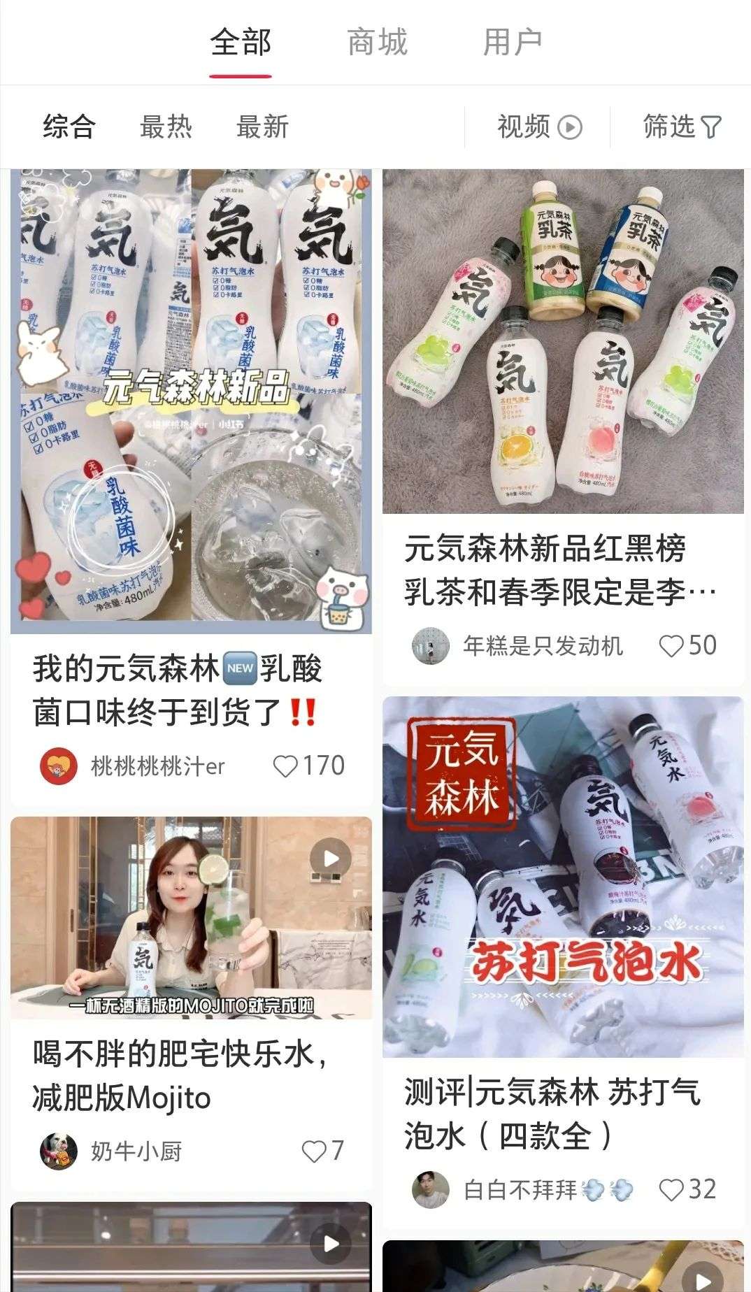 输入“元気森林”四个字,在小红书APP上进行搜索,可得笔记6261篇,涉及产品测评、减脂饮品推荐、饮料拍照姿势分享等多个种类;而在抖音,仅参与“元気森林”这一话题的相关视频便有628个,播放量达5579.5万次。