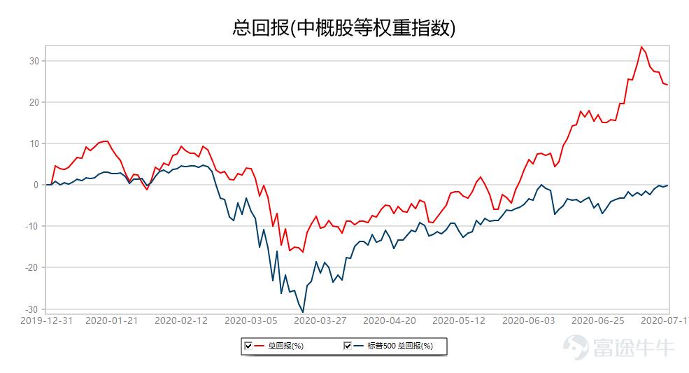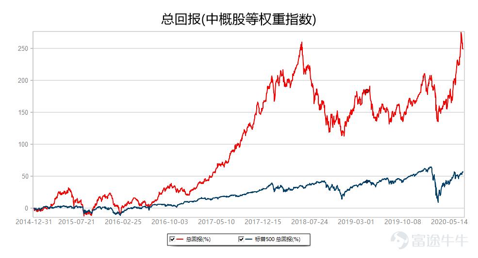 2015年1月1日以来中概股等权重指数上涨249.13%,跑赢标普500指数,相对回报率为192.51%。