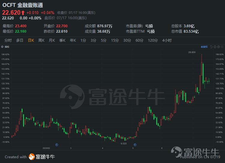 金融壹账通(OCFT.US)在持续大涨后,跟随金融、保险板块调整,本周大跌16.19%。