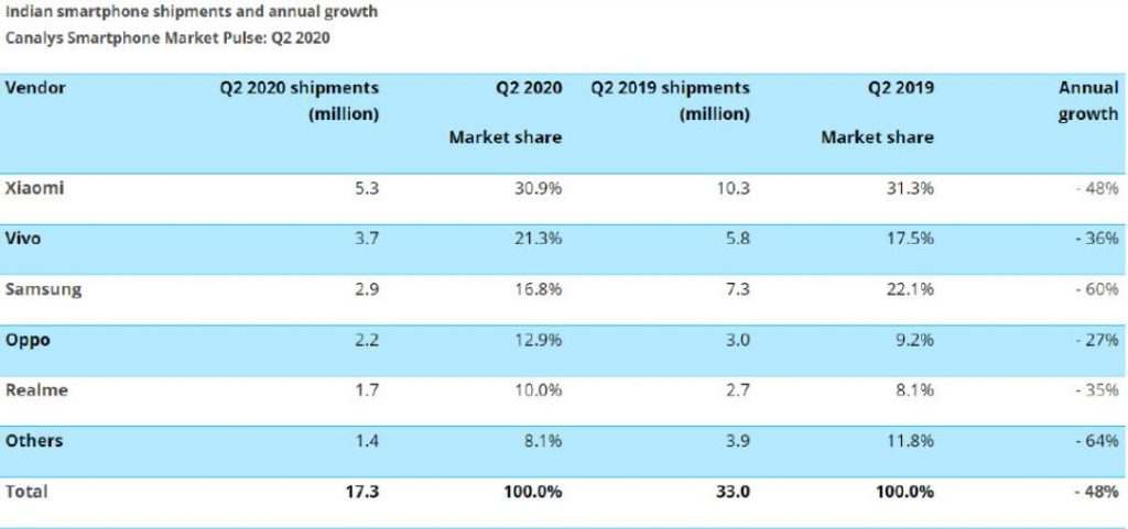 具体到品牌上,第二季度中国的手机品牌占印度手机市场的80%,但每个手机品牌都出现不同程度的下滑。其中小米的市占率虽然依旧排名第一为30.9%,出货量则为530万,但同比下降48%;