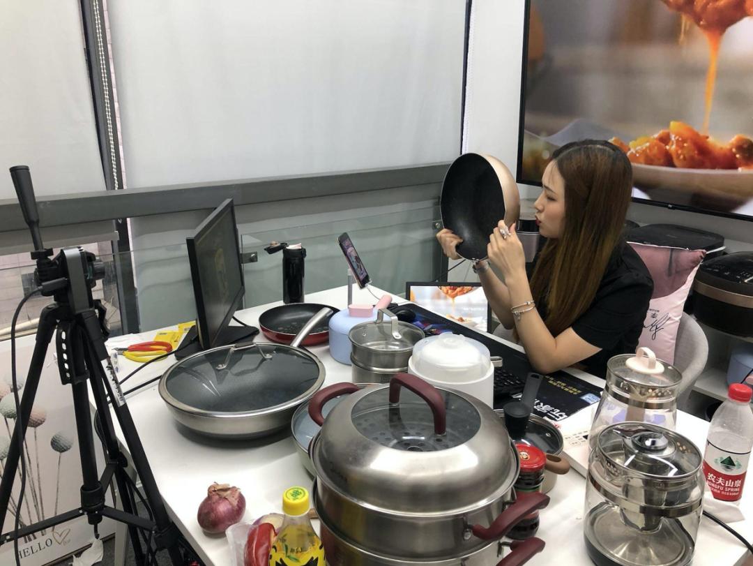 一心多用是主播们需要具备的基本素质。运营主管婷婷带我径直走进七久直播间,她只瞥了我们一眼,嘴皮子没有停,依旧按照原来的节奏介绍手上的那款锅,同时手动上架了一条商品的购买链接。