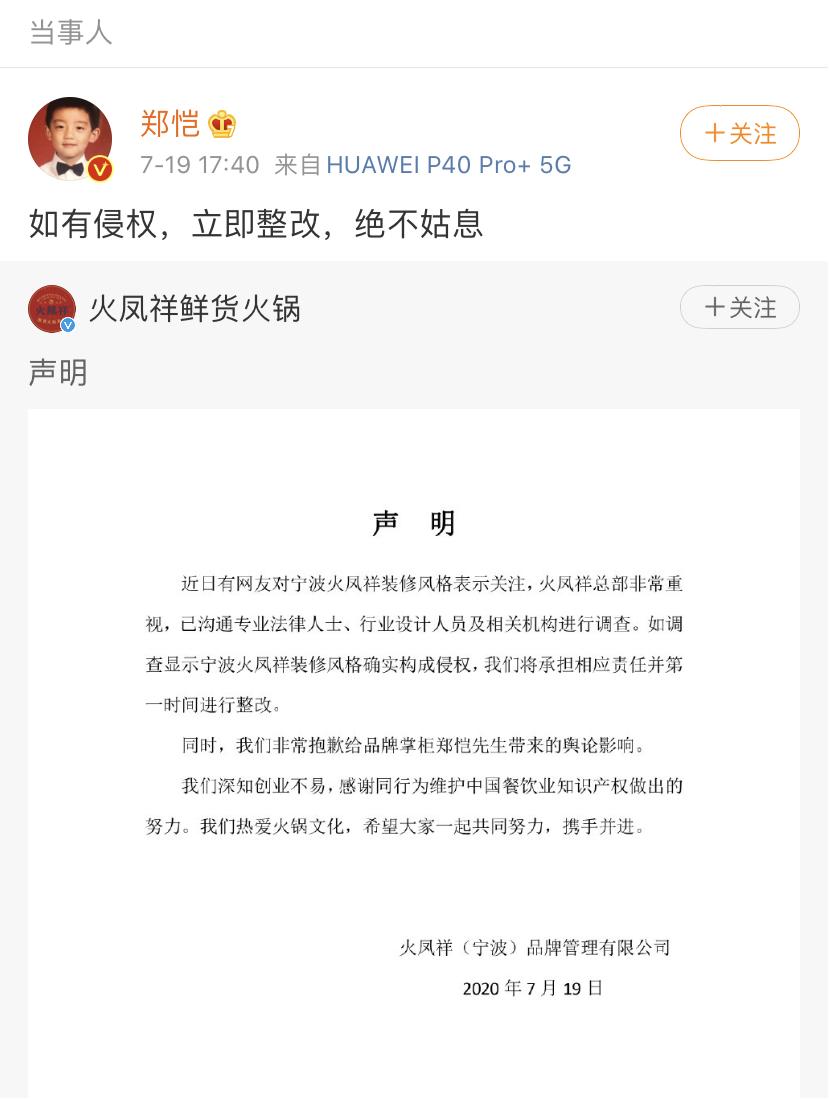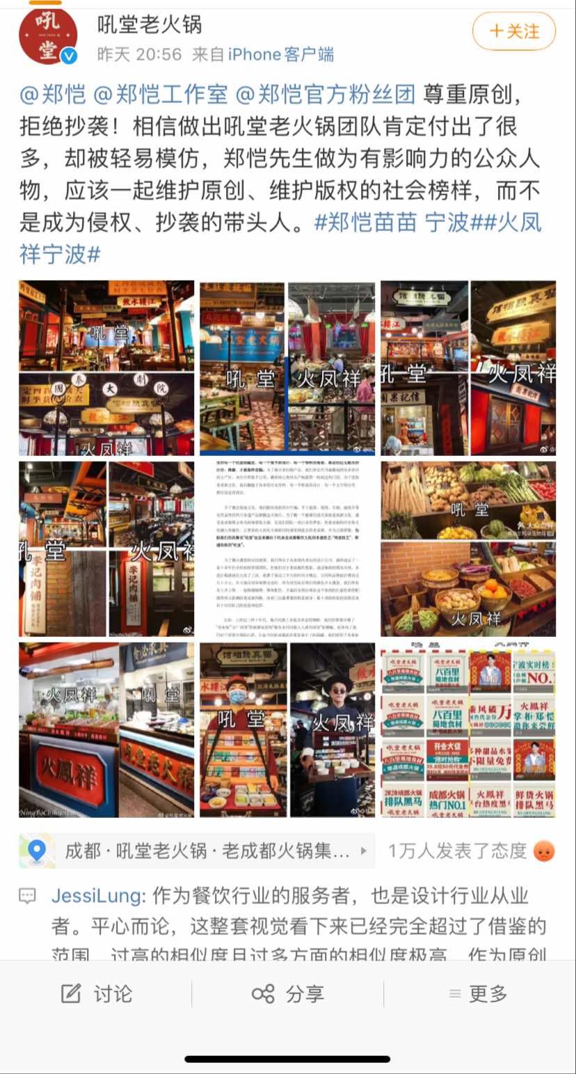 就在前天(7月18日),郑恺现身位于宁波的“火凤祥”火锅店开业现场,牌面之大,震动当地。没想到不久,就被来自成都一家叫“吼堂”的火锅店举报抄袭。今天一早,此事一度被顶上了热搜第一。