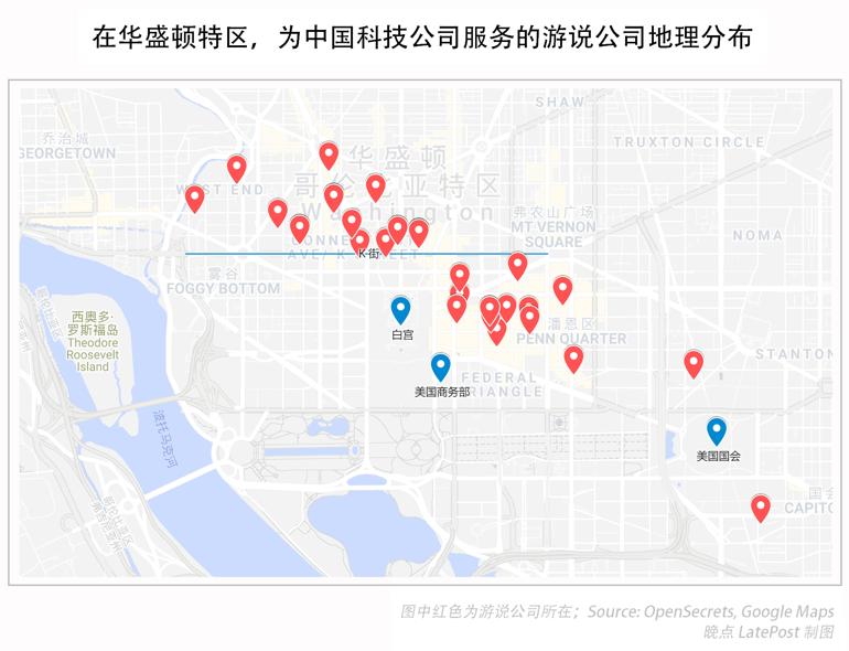 中国科技公司雇佣的游说公司,有约一半在横贯华盛顿城区的 K 街周围。这条 6.4 公里长的街市游说公司最密集的地段。K&L Gates 就位于 K 街与白宫中轴线的交界处。