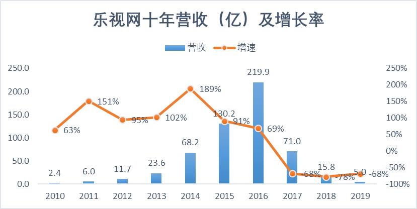 2017年,乐视网的营收在这一年下跌67.7%,但这还远未触底。2018和2019年,营收规模又分别下滑77.8%和68.8%。