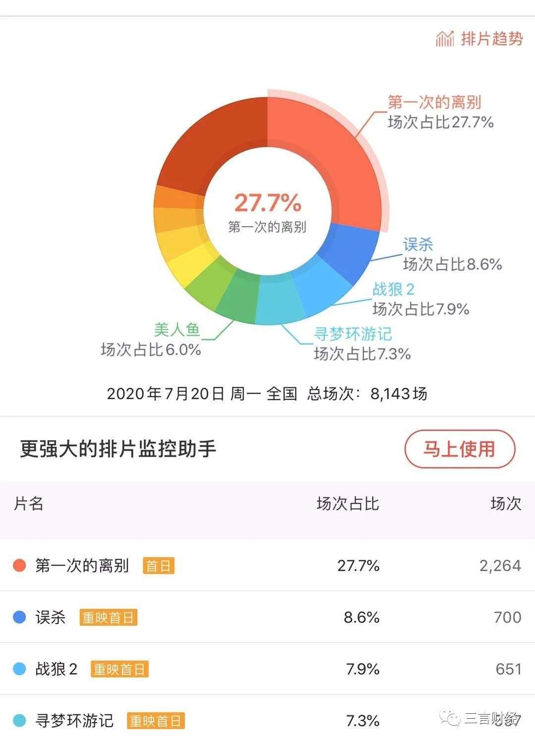 今日放映影片中第一次的别离、误杀、战狼2三部影片场次占比居前三。