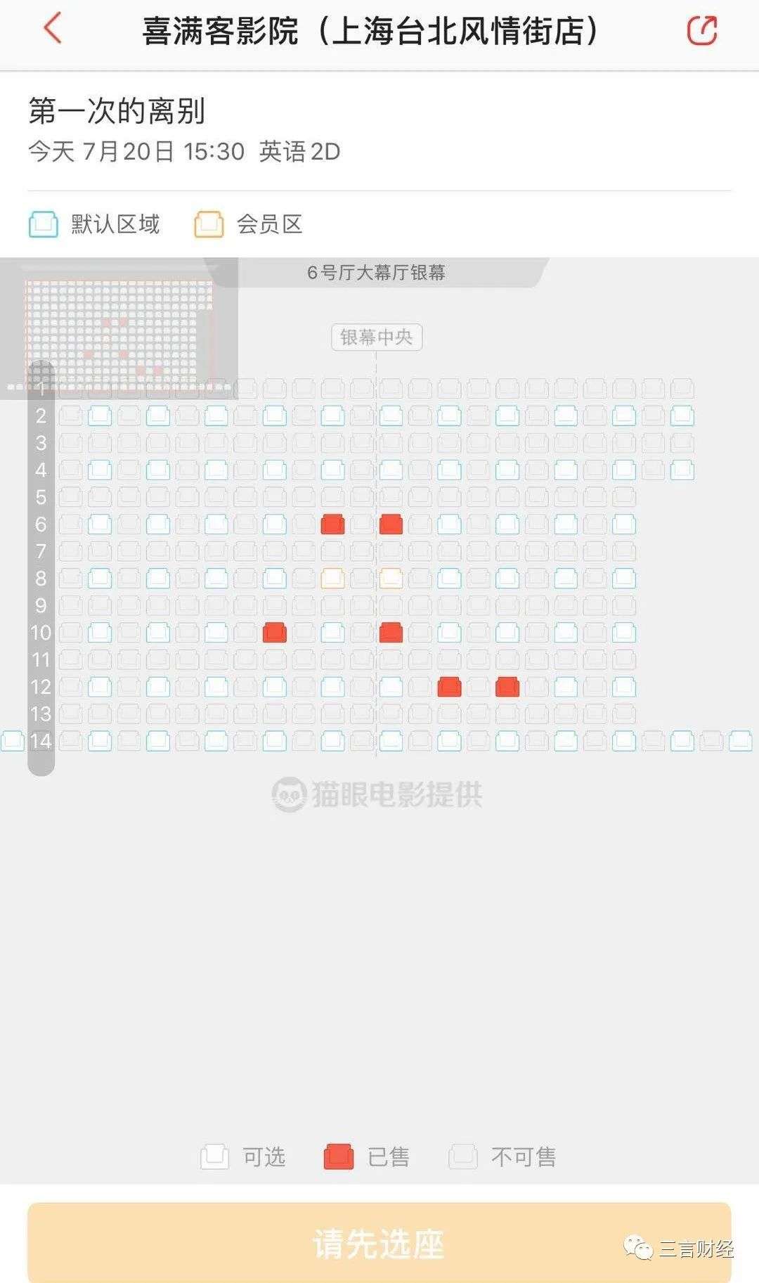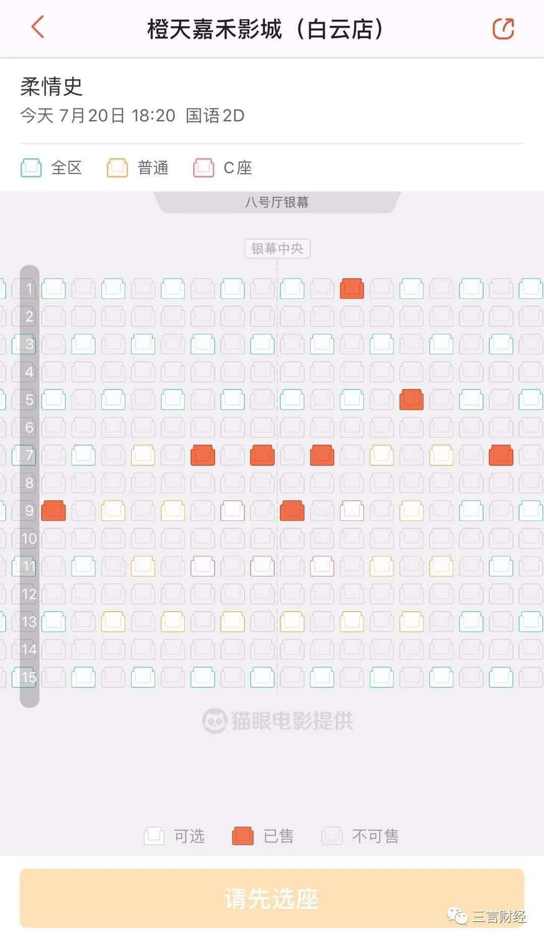 据购票界面显示,上海、广州、深圳等多地电影院均采用隔座售票形式,购票时软件设置不可售座位,单人观影座位四周均被隔开或每排之间隔开。