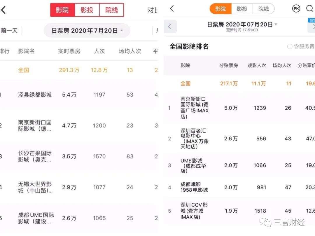 对比影院数据可以发现,猫眼专业版前三分别是泾县绿都影城、南京新街口国际影城、长沙芒果国际影城。
