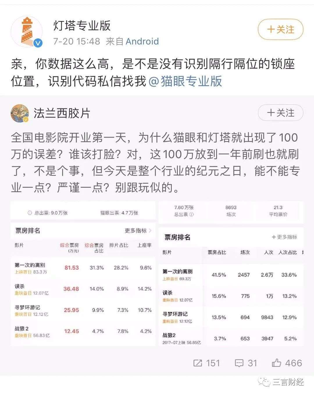 猫眼、灯塔数据相差100万,谁的数据准确?