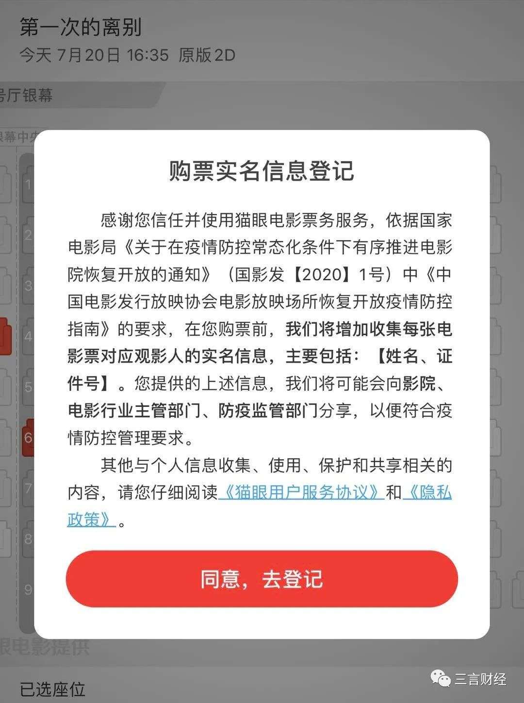 购买电影票需要进行实名登记,购票前,将增加收集每张电影票对应观影人的实名信息,包括姓名、证件号。
