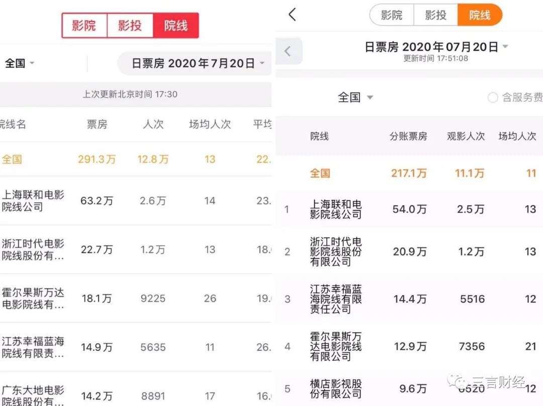 多家院线数据同样存在差异,同一院线票房数据甚至相差近10万。