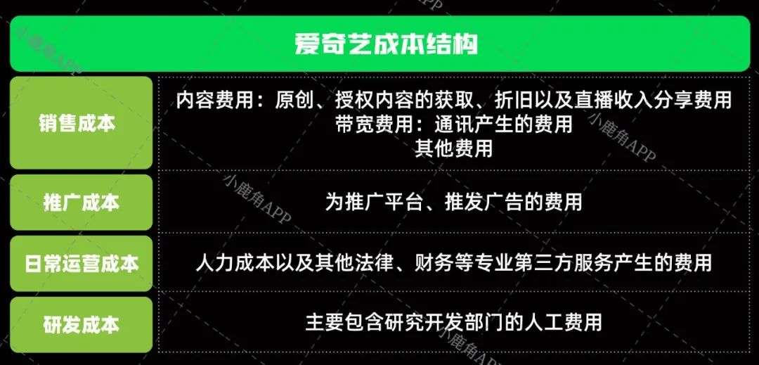 而爱奇艺的收入主要依靠用户付费订阅,吸引付费用户则主要依靠高质量的自制剧以及其他需要购买版权的优质节目,因此成本颇高。