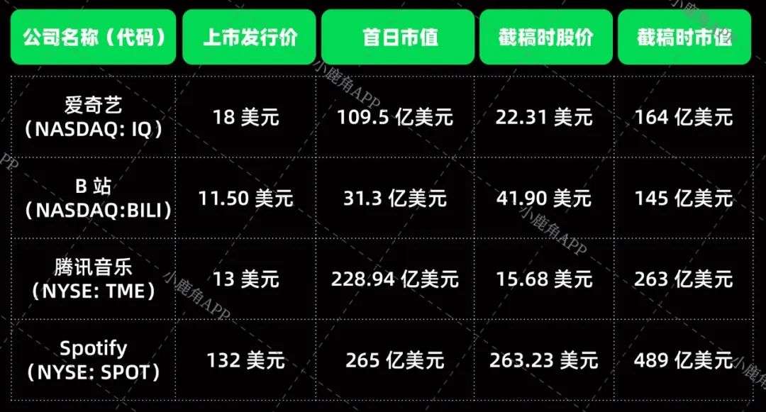 作为国内视频流媒体的代表,爱奇艺和B站在2018年先后于纳斯达克上市,对比同年登陆纽交所的音乐流媒体代表——TME和Spotify来看,二者市值并不算理想,皆在200亿美元以下徘徊。