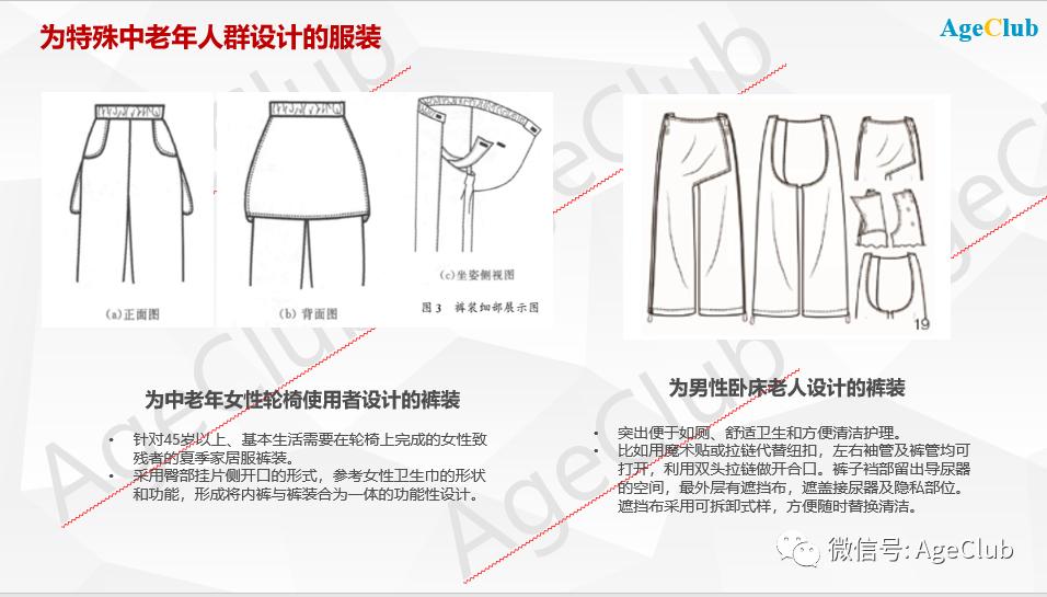 有专家提出了专门为中老年女性轮椅使用者设计的裤装,采用臀部挂片侧开口的形式,参考女性卫生巾的形状和功能,形成将内裤与裤装合为一体的功能性设计。