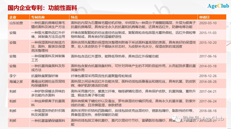 美、日、欧等发达国家是功能性面料的传统强国,国内企业在过去十年也积极开发功能性面料,纺织面料企业山东如意,运用品牌安踏、李宁,男装企业海澜之家、利郎等都积累了相关专利,其中一部分是明确为了中老年人需求服务的,比如保暖、保湿、除臭去异味、抗菌杀菌等功能性面料。