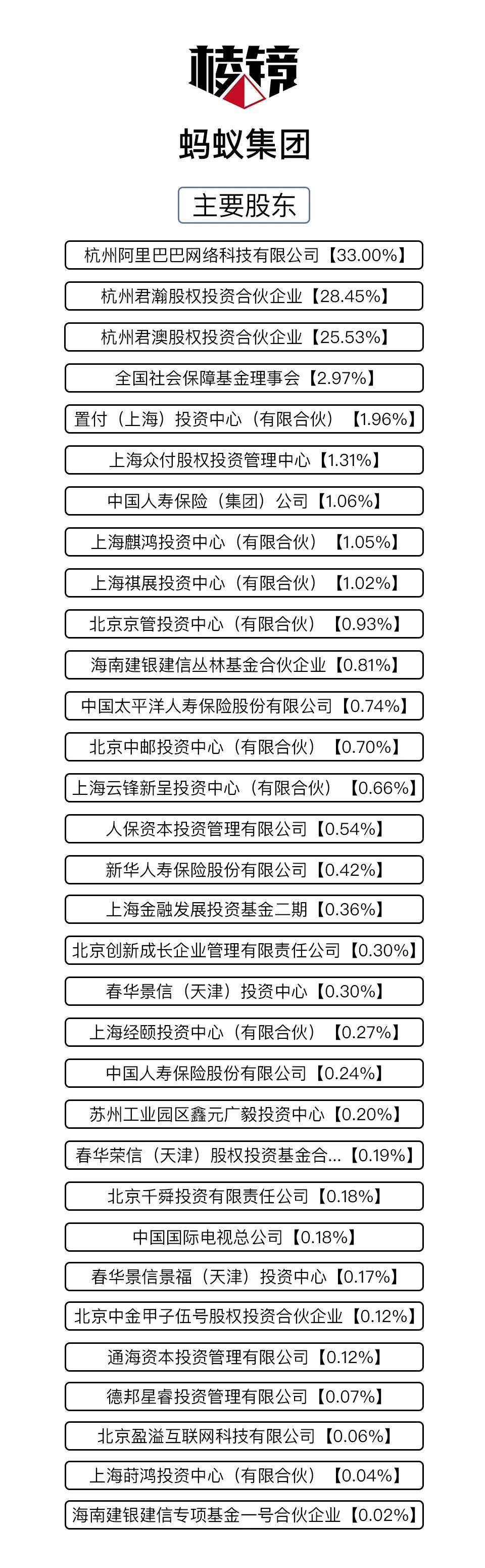 翻开蚂蚁集团的32家股东名单,阿里巴巴以33%的持股比例成为第一大股东,杭州君瀚股权投资合伙企业持股28.45%、杭州君澳股权投资合伙企业持股21.53%紧随其后。