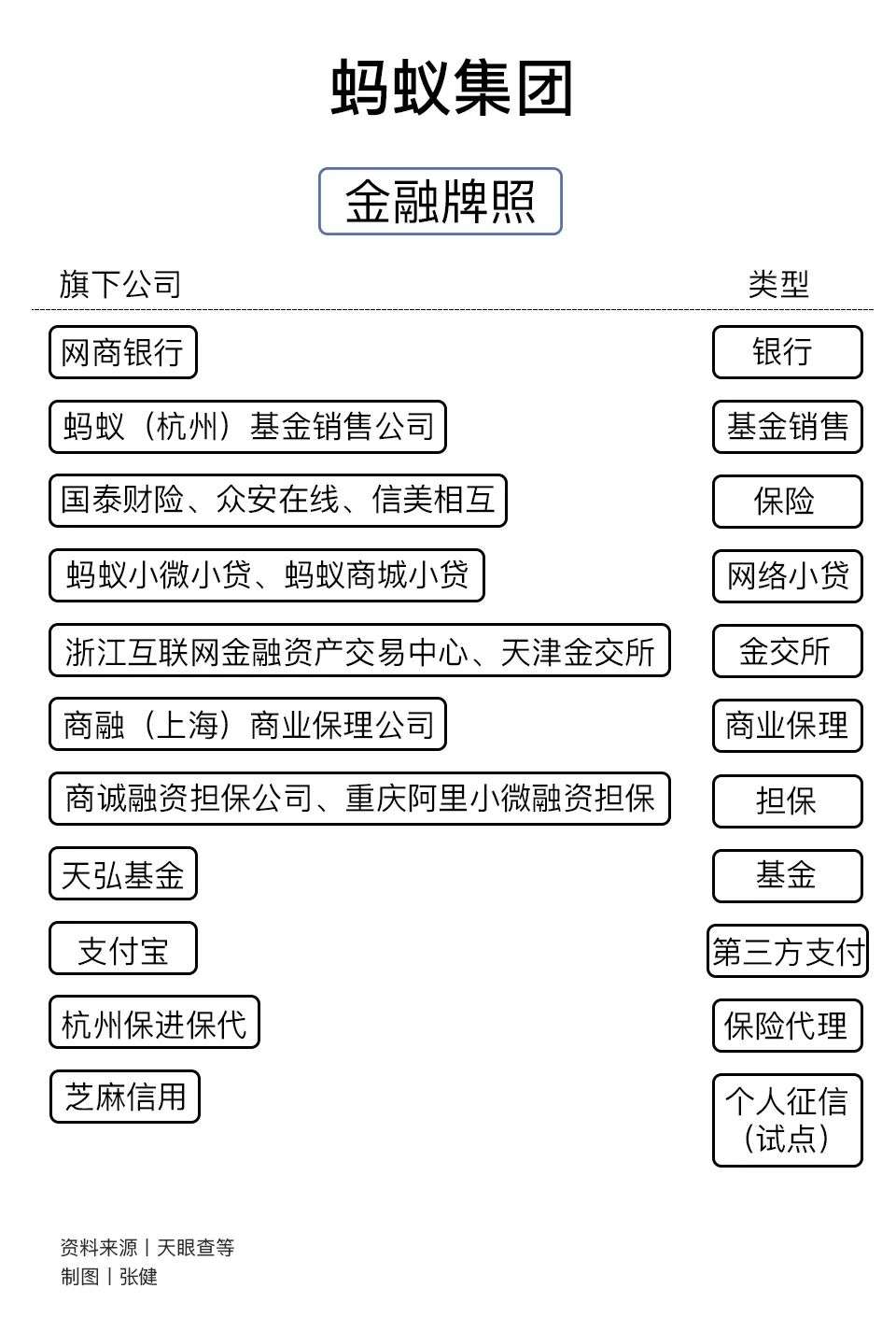 在金融业务布局中,蚂蚁手握最多、最全的金融牌照,主要有支付牌照、网络小贷、银行、保险、券商、基金、金融资产交易所等。这也使得蚂蚁更多被看做一家金融控股公司,在2018年5月传出的五家金融控股监管试点名单中,“蚂蚁金服”赫然在列。