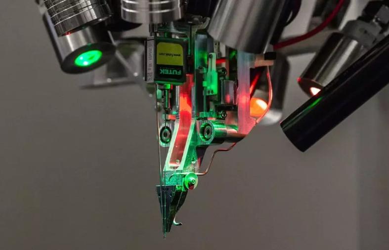 作为一家脑机接口研究公司,马斯克希望可以像微创眼科手术一样安全无痛地植入脑机接口芯片。成立两年后,Neuralink 发布了其首款产品,如下图所示,看起来像一台「缝纫机」。
