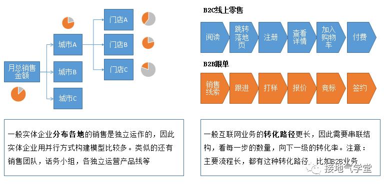 当单个指标不能全面描述现状的时候,就得一系列指标有逻辑地呈现,以全面描述现状、发现问题,这是所谓:现状描述模型。业务常见逻辑有2种:串联式、并联式。串联式模型用于描述一个前后分n个阶段的流程,需要完成一步再到下一步。从流程起点开始,到终点结束;并联式模型描述一个任务分开同时由各个线独立完成。从总目标开始,到执行任务的最小单位结束(如下图)。