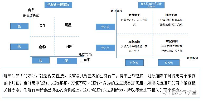如果判断一个指标好坏的标准只有一个,比如成本、利润,这时候是不需要模型的。大家都知道成本越低越好,利润越高越好,业务完全可以直接给判断标准。如果判断业务好坏需要2个标准,且这两个标准相关度低,这时候可以用矩阵模型来进行分类。常见的重要紧急矩阵,波士顿矩阵,质量/数量矩阵,都是这个原理(如下图)。