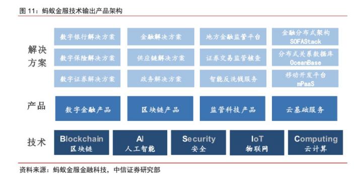 蚂蚁目前在科技方面聚焦于「BASIC」基础技术,即 Blockchain (区块链)、AI(人工智能)、Security(安全)、IoT(物联网)和 Cloud computing(云计算),以此为基础研发出了数字金融产品、区块链产品、监管科技产品和云基础服务。