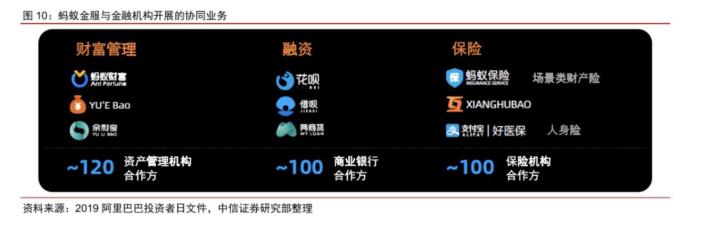 金融业务也是蚂蚁手中的王牌。目前蚂蚁金服与金融机构开展的协同业务包括以蚂蚁财富、余额宝、余利宝为代表的财富管理服务;以花呗、借呗、网商贷为代表的融资服务;以蚂蚁保险、相互保、好医保为代表的保险服务。