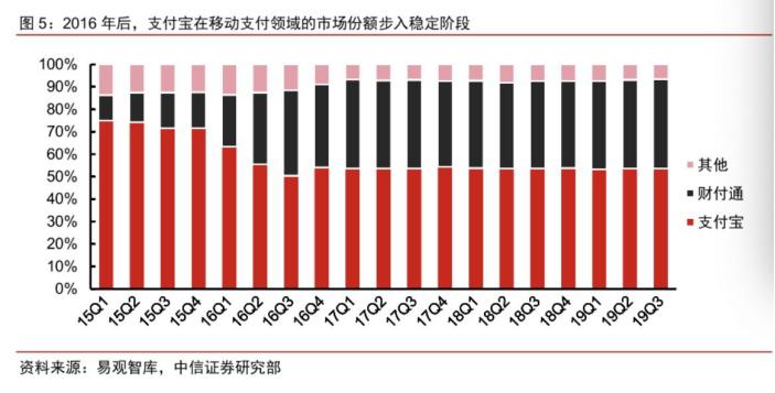 支付是蚂蚁金服的命脉,支付收入主要来自于2C端端支付宝、银行卡转账、信用卡还款及2B端的线上线下支付。从易观智库公布的第三方数据看,2019 年前三季度全行业第三方综合支付和移动支付规模分别为 182 万亿/149 万亿,蚂蚁金服市场份额为47%/54%。