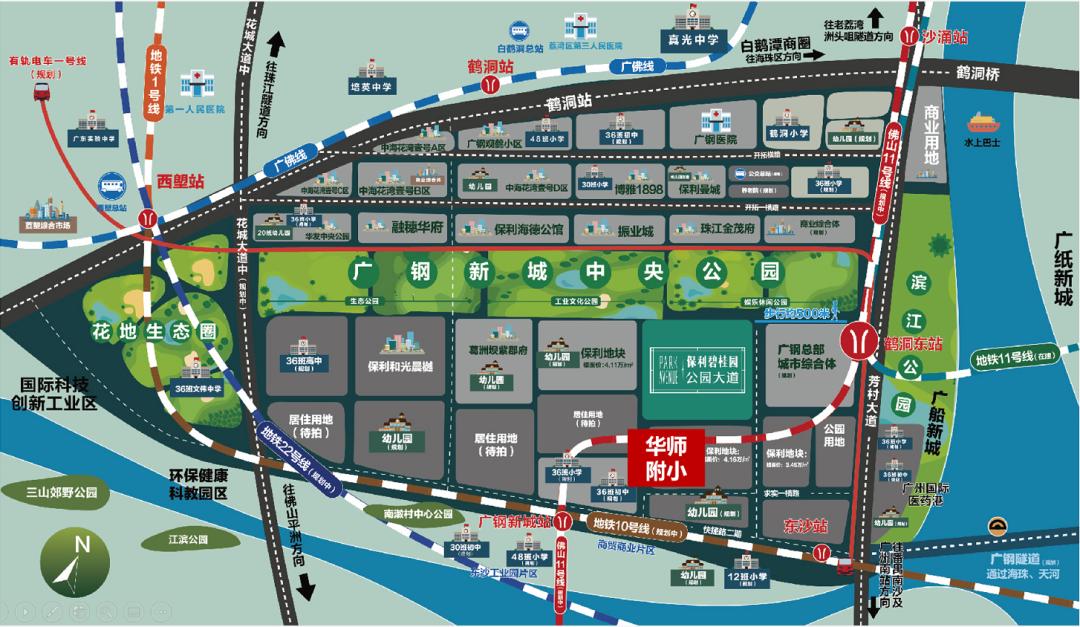 广钢新城以中央公园为界限,分为南北区,北区的中海花湾壹号,一个项目就是7000户,最高60层,密度非常大,北边还有这么多项目,道路又很窄,双向两车道,特别堵;