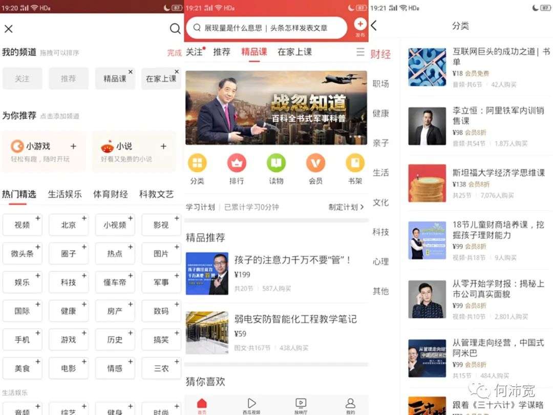 今日头条-精品课入口,以职场、泛素质严肃内容为主;在家上课,目前没有上架内容