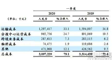 其中以中通快递为例,根据官方公布的2020年第一季度财报数据显示,剔除跨境业务收入后其单票收入1.52元,同比下降19.4%。而在成本方面,受益于高速公路免过路费政策以及油价的下跌等因素,该季度的运输成本同比下降18.6%至13.0亿元,单票运输成本较去年同期下降至0.55元;但分拨中心的运营成本同比增长8.4%至9.7亿元,单票分拨成本为0.41元。