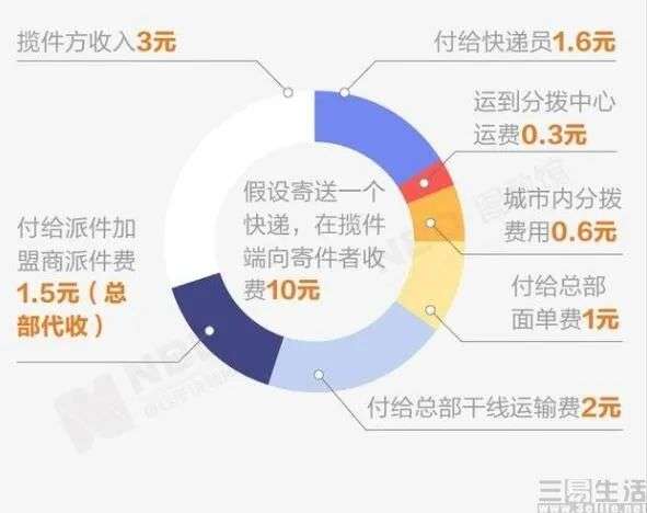 在这一报道中还曾举例称,假设用户付出10元快递费,那么其中的3元归揽件方,1.6元归快递员,快递公司总部真正收到的只有三项费用,即为面单费1元、干线运输费2元,以及付给派件加盟商派件费1.5元(总部代收)。