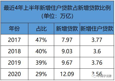 2020年上半年的新增住户贷款,只新增了3.56万亿,创4年来新低。但要知道的是,2020年上半年新增贷款却达到了12.09万亿,比2019年上半年暴增了25%。