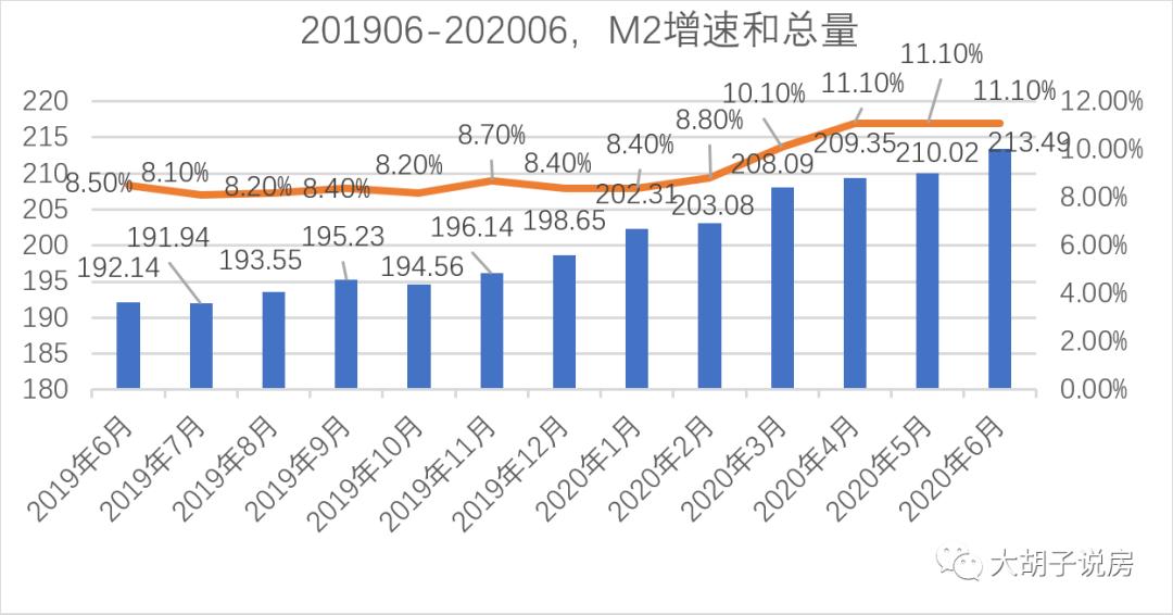 从2020年3月开始,M2就开启了10%以上的增速增长。截止到6月,M2已经达到了213万亿。