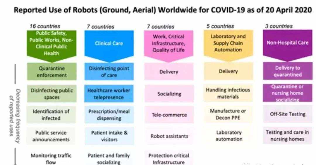 这张图表从国际范围统计了疫情期间陆空机器人的使用情况:截止到4月20日全球已有16个国家在隔离、消毒、确诊、公共信息传播和交通管控方面应用到了机器人,且已经有7个国家在医护中心已经将机器人作为“医护助理” 承担远程通讯、药物运输和患者问诊等职能。而另有七个国家将机器人投入使用在基础设施建设、保证居民生活品质方面。由此可以看出,已经有越来越多的国家开始具有“机器人”意识并将其投入使用。而今后在公共医疗卫生、公共安全、基础设施建设等领域也将出现越来越多的智能机器人.