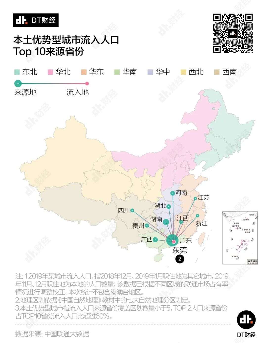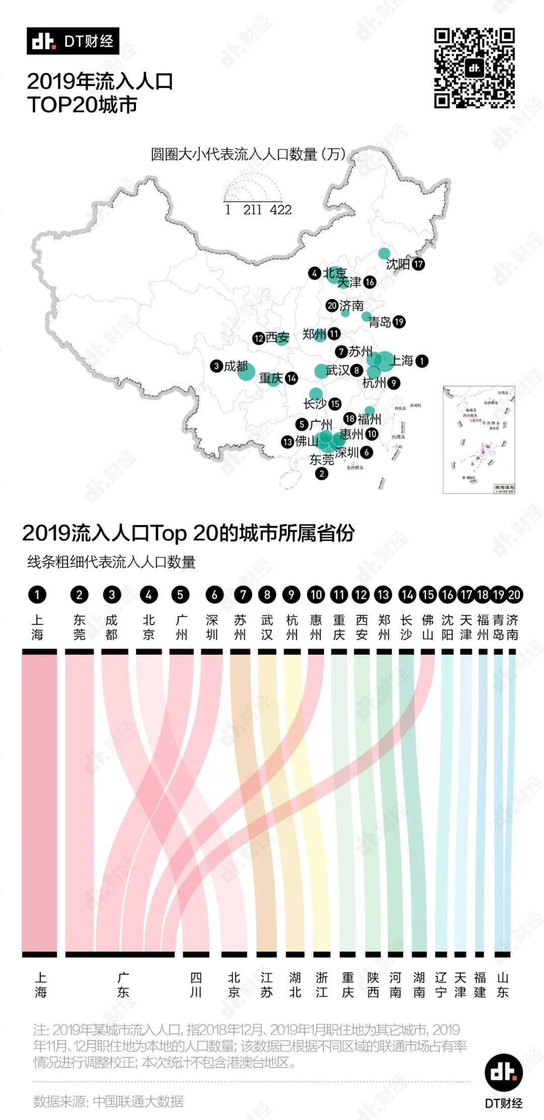 上海流入人口最多,不太令人意外。而第二、三名则是东莞和成都,北京、广州、深圳仅进入前六,多少有些出人意料。