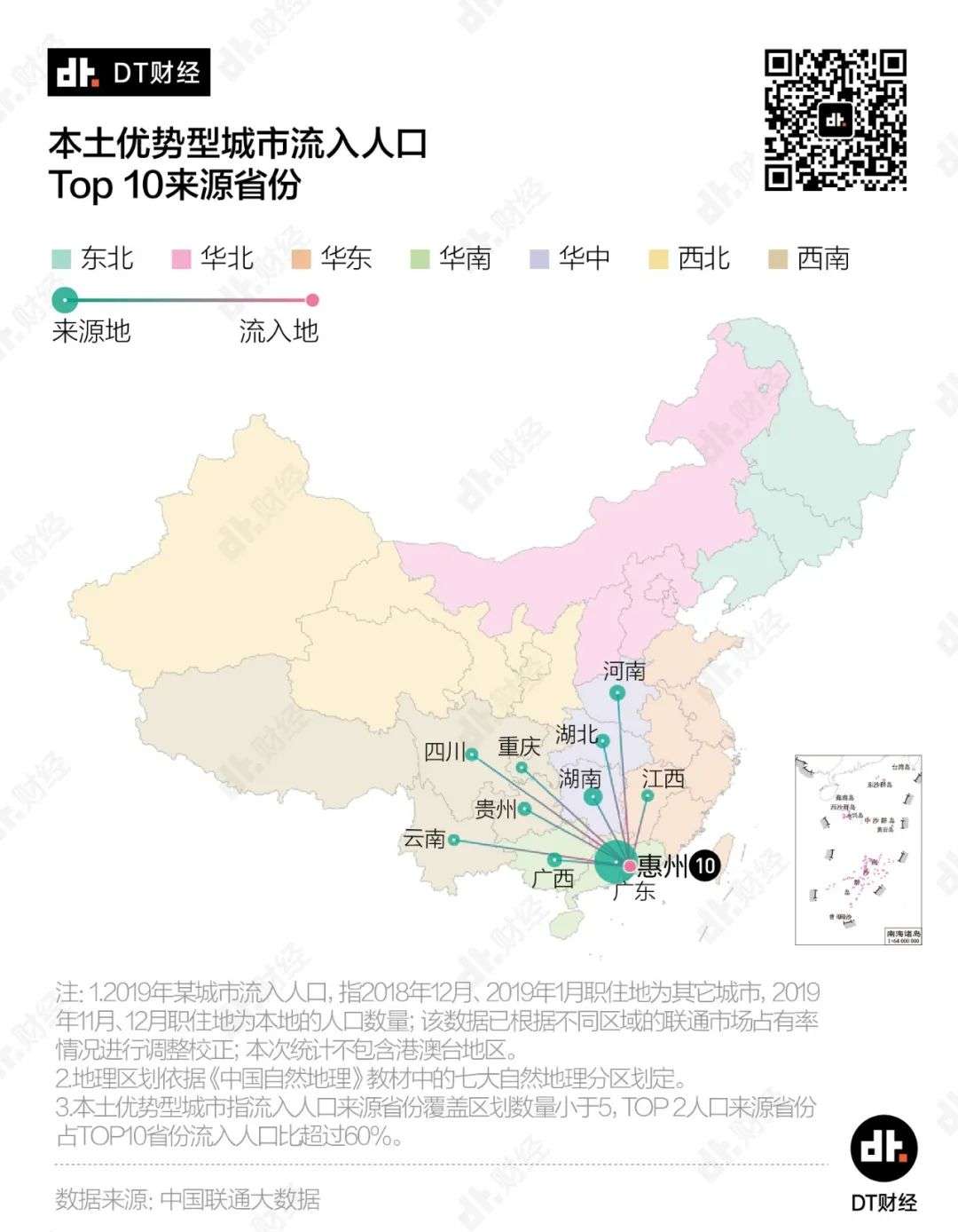 还有两个城市的排名,也值得注意:苏州流入人口规模超过了武汉和杭州,而靠近广州、深圳和东莞的惠州,力压一众省会和重点城市,进入了TOP 10。