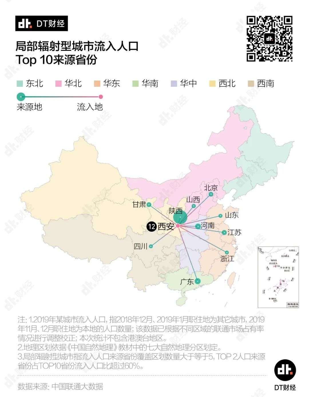 简单划分一下,我们发现覆盖区划最多的城市,并不是一线城市,而是衔接着广大西部和中部地区的西安,其人口热门TOP10来源地分布在除了东北之外的六大区域。