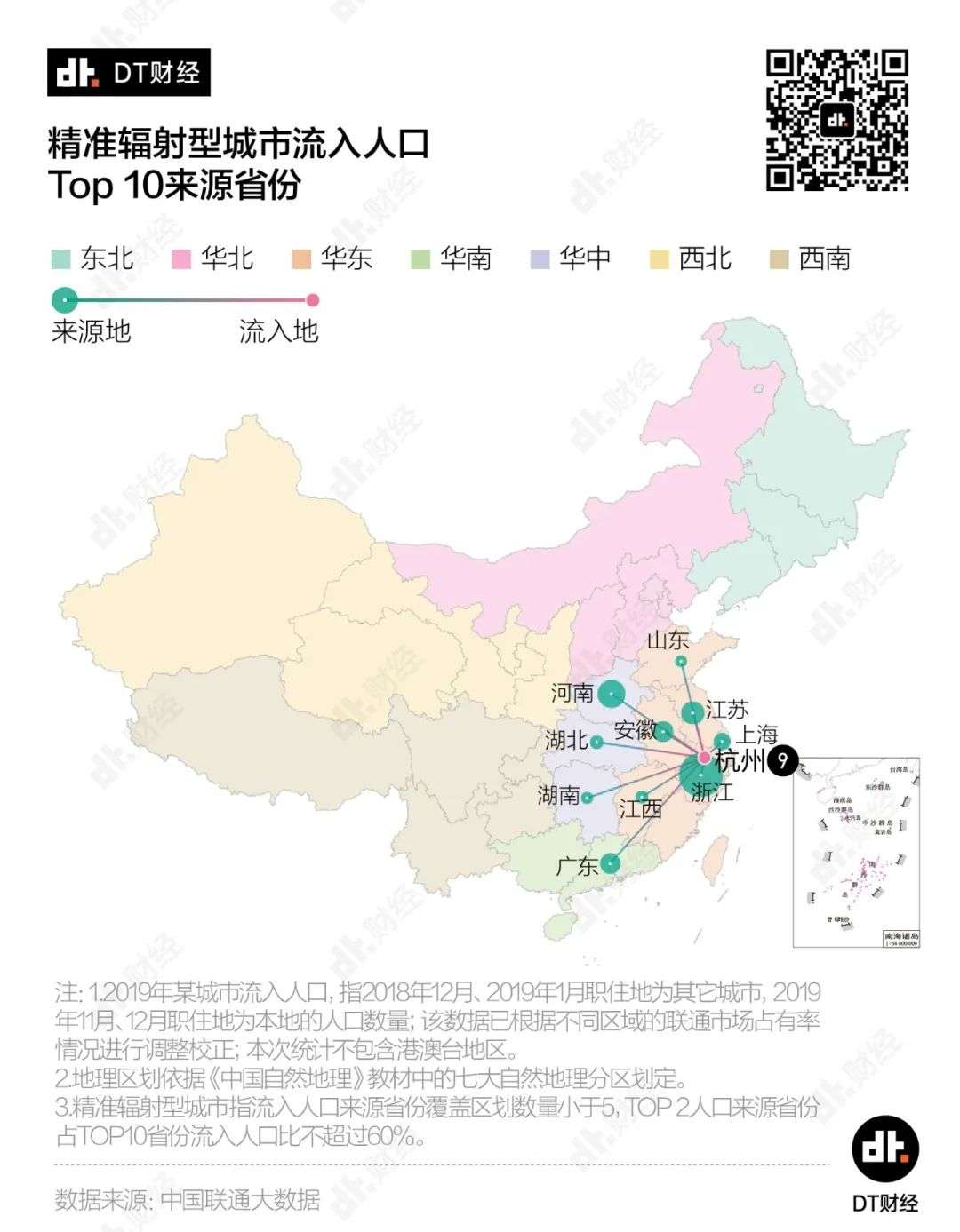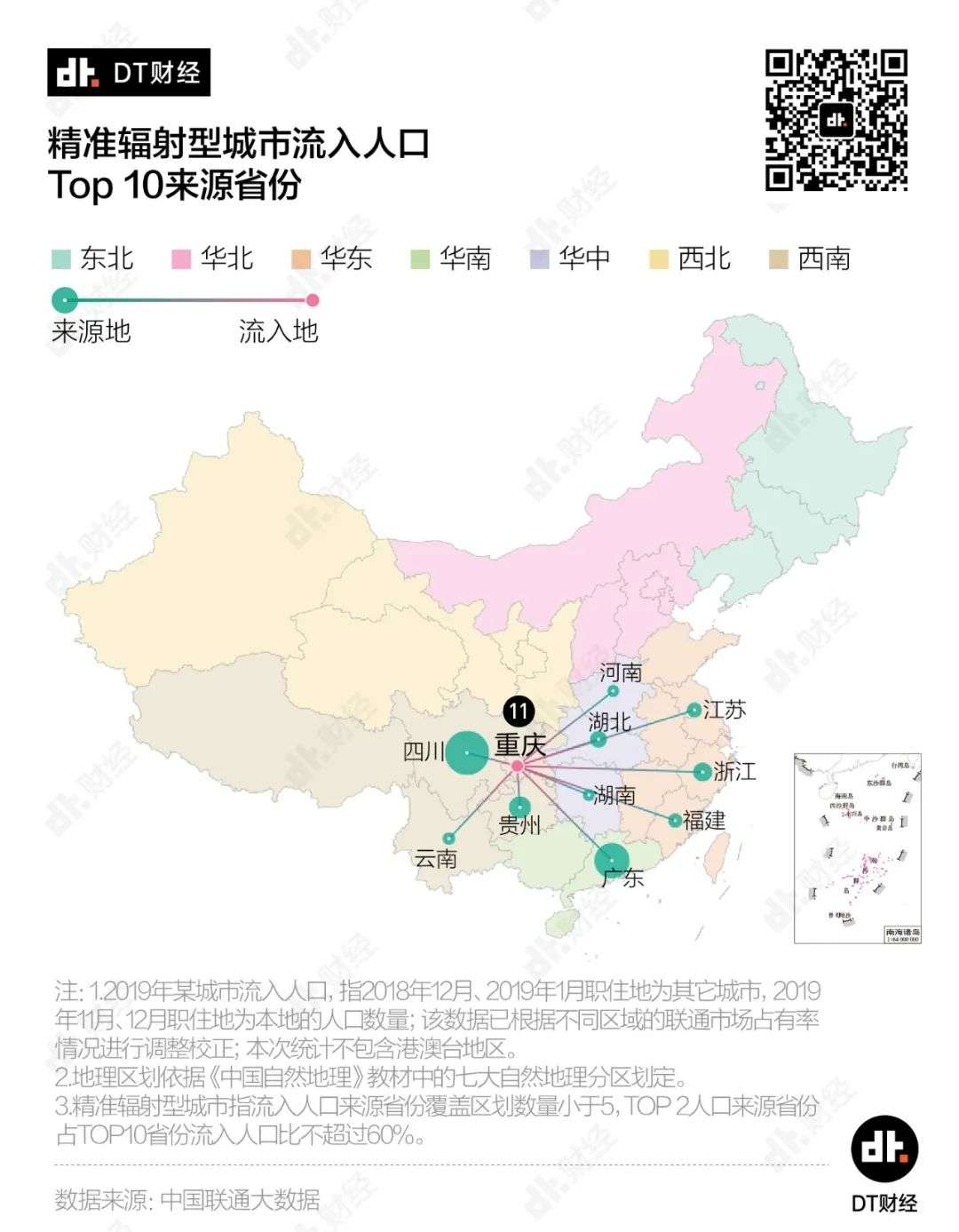 C类:精准辐射型,如杭州、重庆。这两座城市的人口来源省份覆盖区划数量虽然不占优势,但是在自己的势力范围内的影响力颇高。