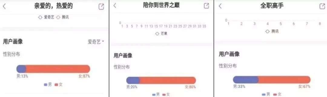 根据艺恩数据,《陪你到世界之巅》《亲爱的热爱的》《全职高手》的受众男女性别比,男性最多的都只有3:7,《亲爱的热爱的》更是接近1:9。