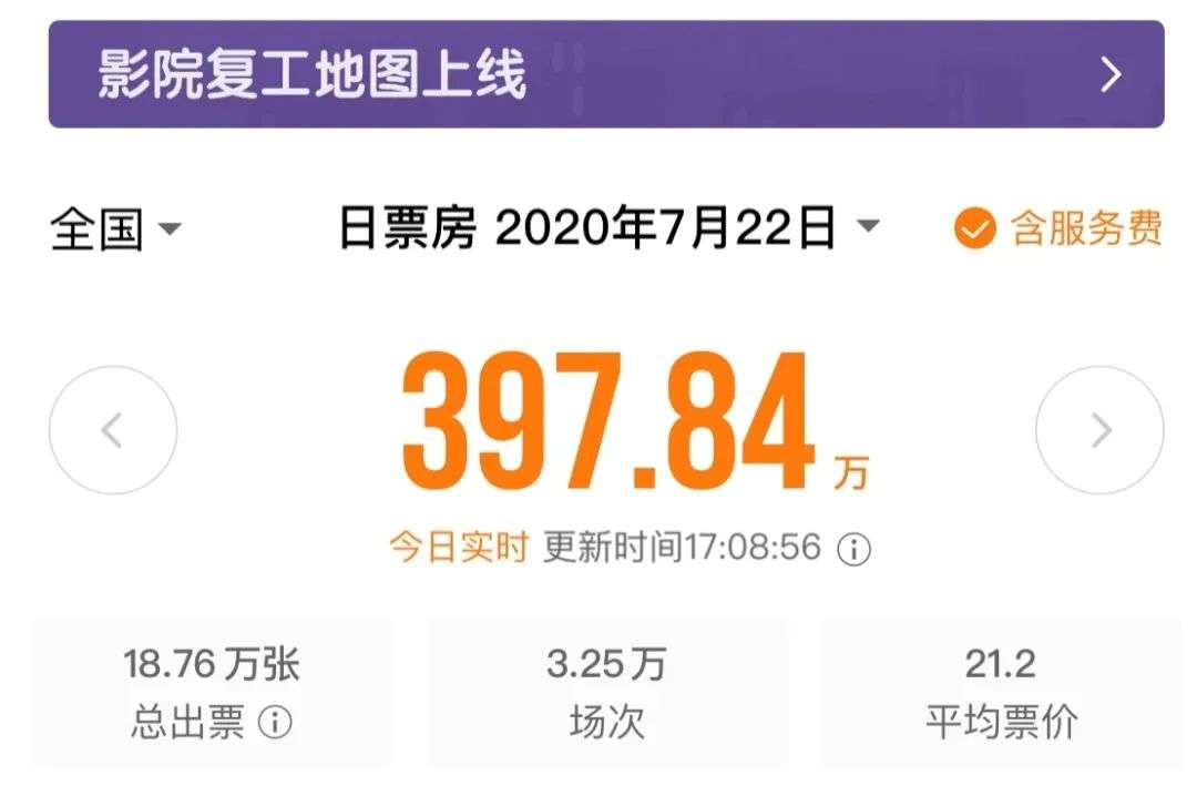 哪怕复工后上映的片子,大多不是新片,影院复工票房,还是在周一工作日的上午11时1分59秒,正式突破100万。