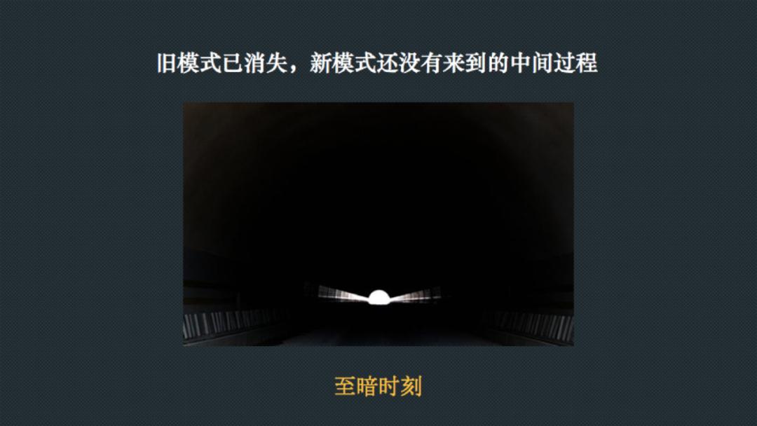 我们经常说至暗时刻,什么是至暗时刻?至暗时刻就像旧的模式和新的模式之间穿越那条深深的隧道,比如说发生了一个重大的事件,迫使我们的认知发生了改变,当我们刚走出旧的认知模式时,还能看到背后旧认知模式的光,但是继续往前走,我们就会陷入黑暗的泥潭,不知道该怎么走。因为旧的光没有了,新的光也没有到来,在隧道中找不到方向。