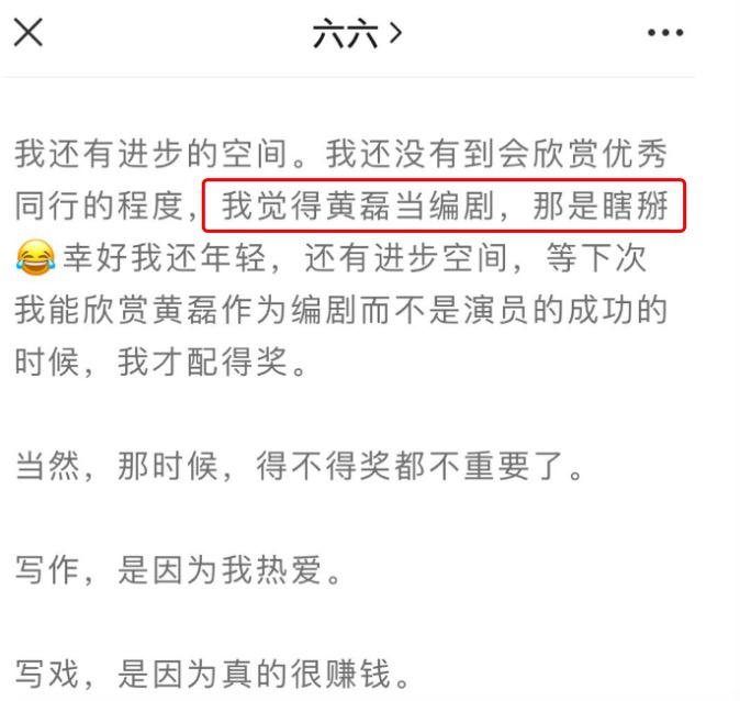 既往辉煌或是限定身份,能俘获观众的始终只有优质内容。在六六吐槽黄磊的“闹剧”里,与其说是一种职业编剧对于演员转型编剧的不认可,不如说是一种对奖项认可和内容市场的焦虑,也是市场热衷转型、但也难以轻易打破的职业壁垒。不过回归市场,此次率先发难,也让六六失了一波市场好感度。