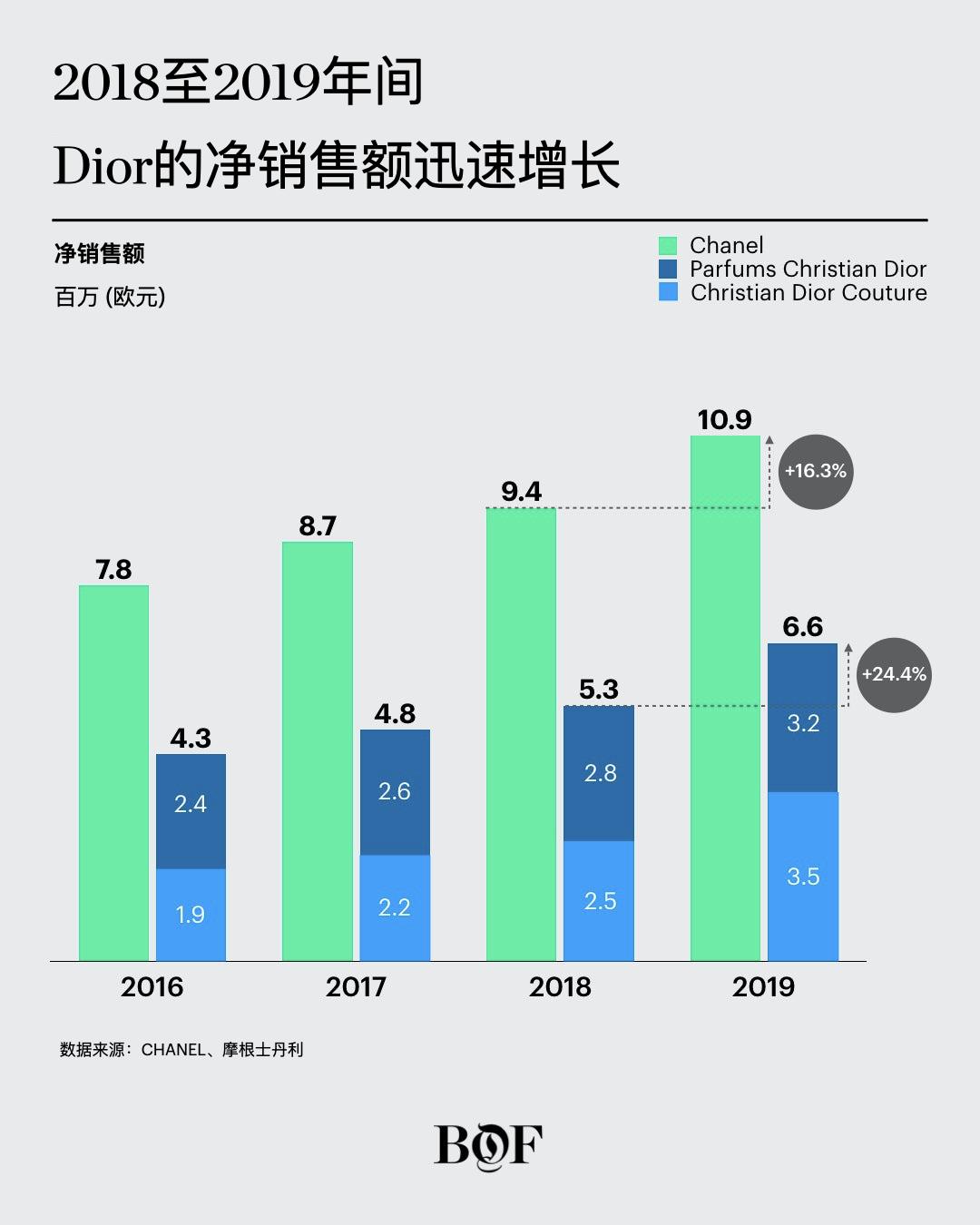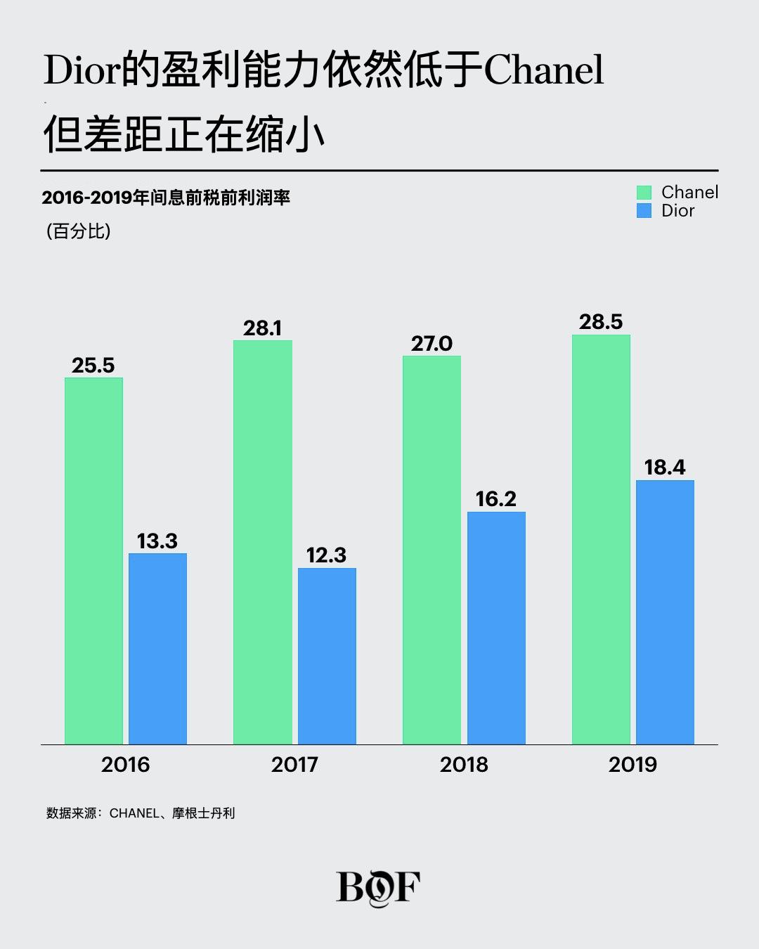 最新的报告估计,Dior在时尚和美妆方面的息税前利润率(EBIT)从2017年的12.3%攀升至2019年的18.4% ,但仍远低于Chanel的28.5% 。