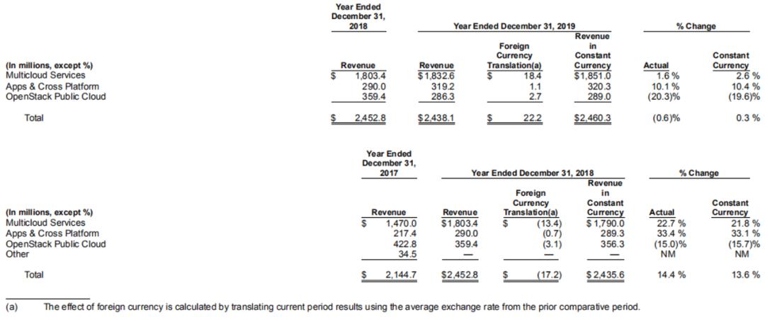 2020年前3个月,Rackspace的核心业务营收为5.894亿美元,同比增5%,按固定汇率,同比增6%。而在2016年截至9月30日的3个月(私有化前最后报告期),其大部分收入来源于OpenStack公有云和大型客户私有云托管,以上报告期内,这些业务营收同比增速为0%,按固定汇率算,同比增3%。