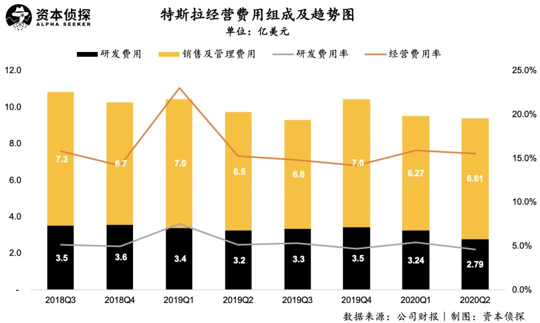 费用方面,特斯拉在疫情期间进一步压缩了研发费用,连续两个季度研发费用都出现环比下降,但销售管理费用出现了2%的同比上升。经营费用率处于近一年中的较高水平,并未在疫情期间严格控制成本。