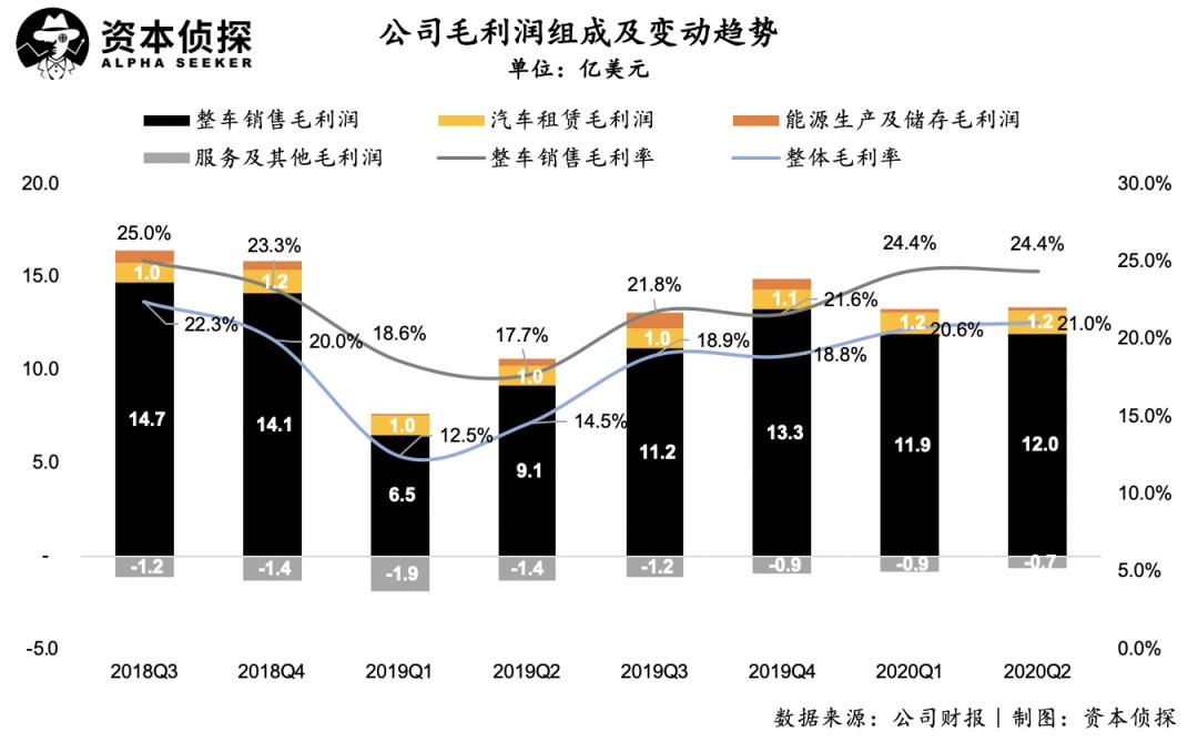 营收方面,特斯拉第二季度实现营业收入60.36亿美元,同比下滑5%,环比上涨1%。其中,整车销售收入为49.11亿美元,在收入规模、占比方面同比、环比都未出现明显变化。在疫情期间全球车市大疲软的背景下,特斯拉维持了一贯的营收水平,已经印证了其较强的抗风险能力。