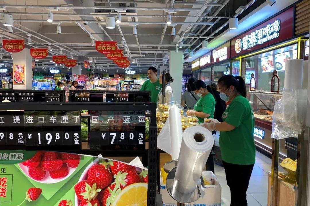 称菜、切水果、理货、记录货架产品数据……几十位身穿绿色制服的店员在各自的岗位上忙碌着。