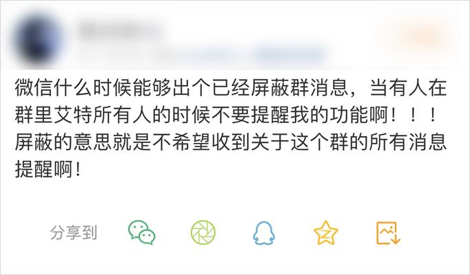 希望微信能明白,我屏蔽群消息的意思就是屏蔽这个群里所有消息,所以群里在@所有人时就不要再提醒我了!